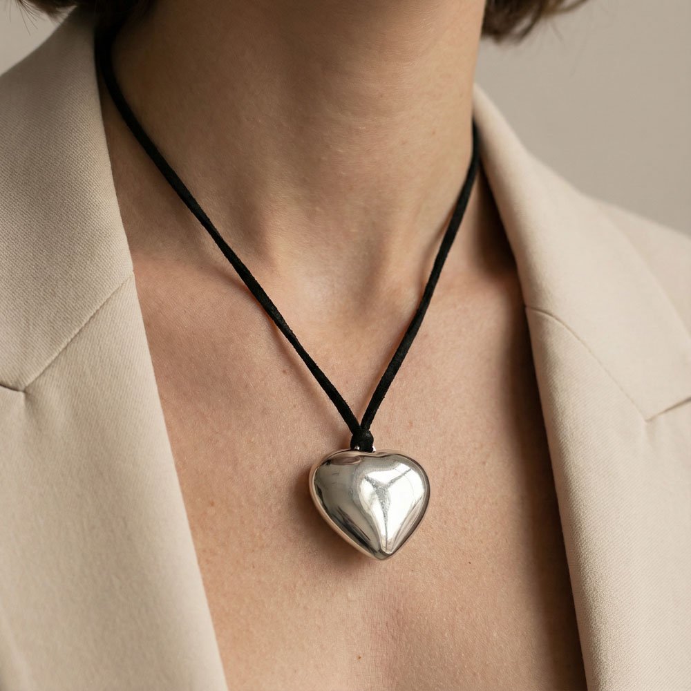 Κολιέ Ασημένιο Hearty S από ανοξείδωτο ατσάλι – εντυπωσιακό μενταγιόν καρδιά με γυαλιστερό φινίρισμα, δεμένο σε μαύρο κορδόνι-βελούδο για ένα mix & match look που αποπνέει δυναμισμό και ρομαντισμό. Ιδανικό statement κόσμημα για casual αλλά και βραδινές εμφανίσεις.