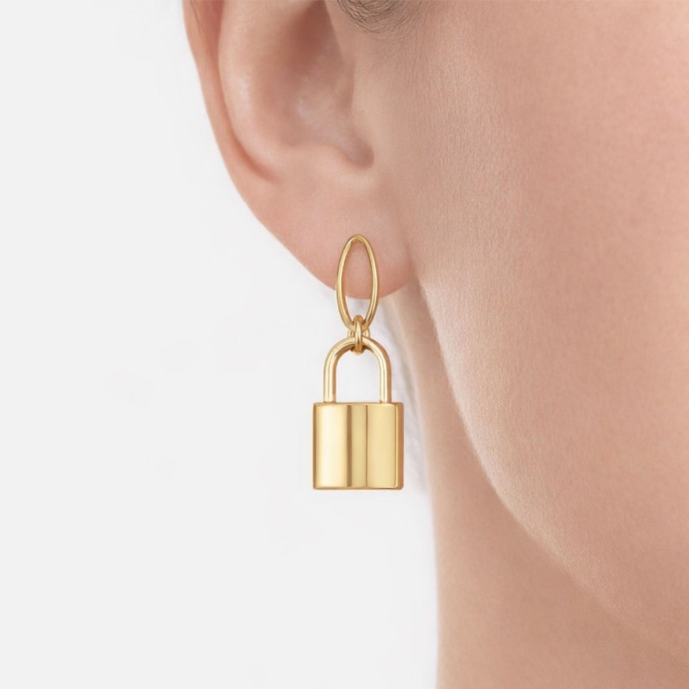 Χρυσά σκουλαρίκια PadLock από ανοξείδωτο ατσάλι, επιχρυσωμένα με 14Κ, με ιδιαίτερο σχέδιο λουκέτου — ιδανικά για να τα φορέσεις με leather jacket ή basic tops για statement urban εμφανίσεις.