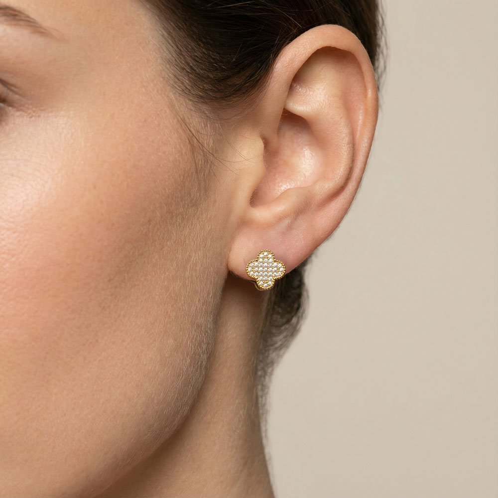 Χρυσά σκουλαρίκια Cleef από ανοξείδωτο ατσάλι, επιχρυσωμένα με 14Κ, με λευκά ζιργκόν και ξεχωριστό design — ιδανικά για να δώσουν λάμψη και κομψότητα σε βραδινές εμφανίσεις.