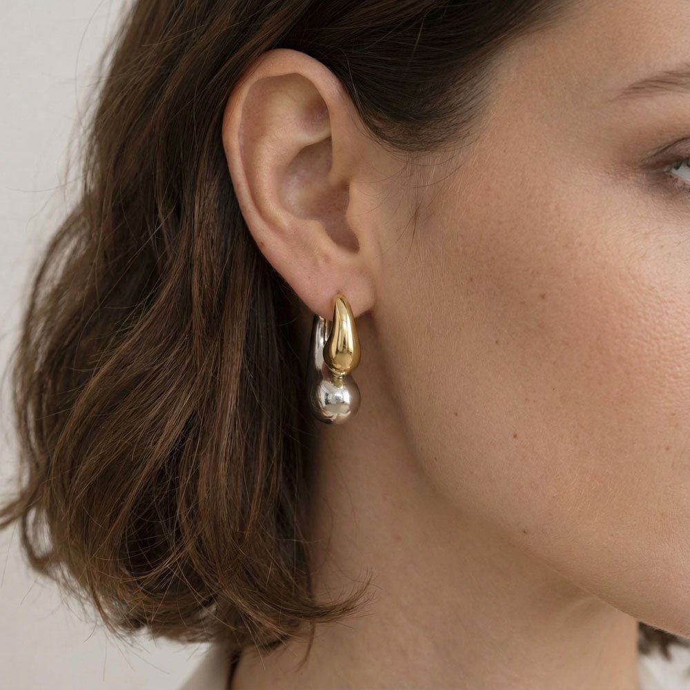 Τα σκουλαρίκια Double Tear της Coshe, σε διχρωμία χρυσού και ασημιού από ανοξείδωτο ατσάλι, ξεχωρίζουν με το μοντέρνο τους διπλό δάκρυ σχήμα που προσφέρει κομψότητα και φινέτσα. Ελαφριά και ανθεκτικά, φοριούνται άνετα όλη μέρα χωρίς να χάνουν τη λάμψη τους. Ιδανικά για βραδινές εξόδους αλλά και για να αναβαθμίσουν casual σύνολα, χαρίζοντας ένα διακριτικό αλλά εντυπωσιακό statement.