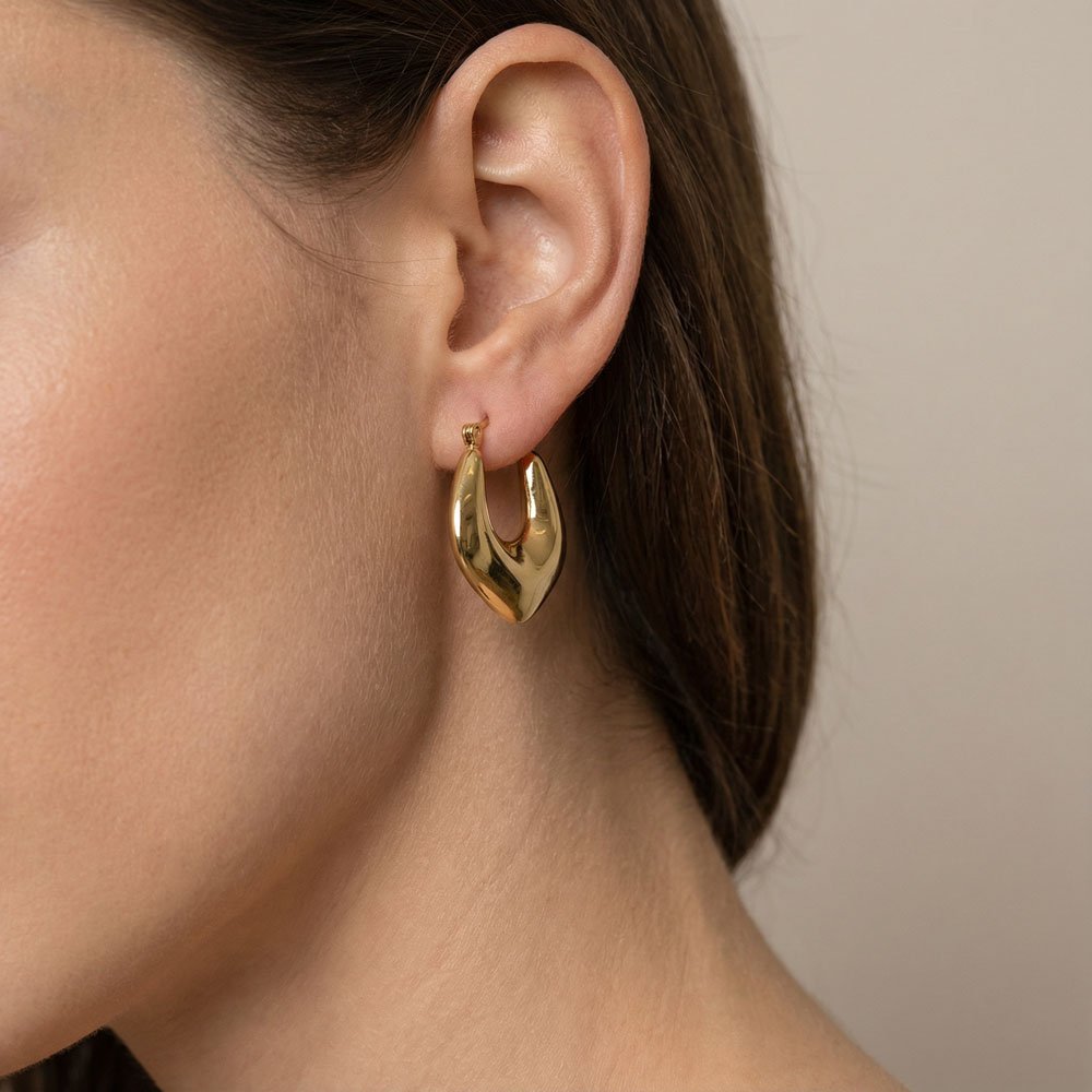 Χρυσά σκουλαρίκια Hackney Nine από ανοξείδωτο ατσάλι, επιχρυσωμένα με 14Κ – ξεχωρίζουν με το μοντέρνο σχέδιό τους και φοριούνται ιδανικά με denim jackets ή μαύρα tops για urban chic εμφανίσεις.
