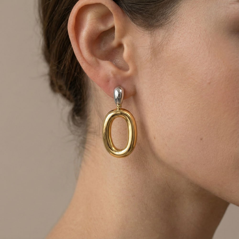 Σκουλαρίκια Luminous Luxe – εντυπωσιακός συνδυασμός ασημί και χρυσού σε bold γεωμετρικό design από ανοξείδωτο ατσάλι επιχρυσωμένο 14Κ.