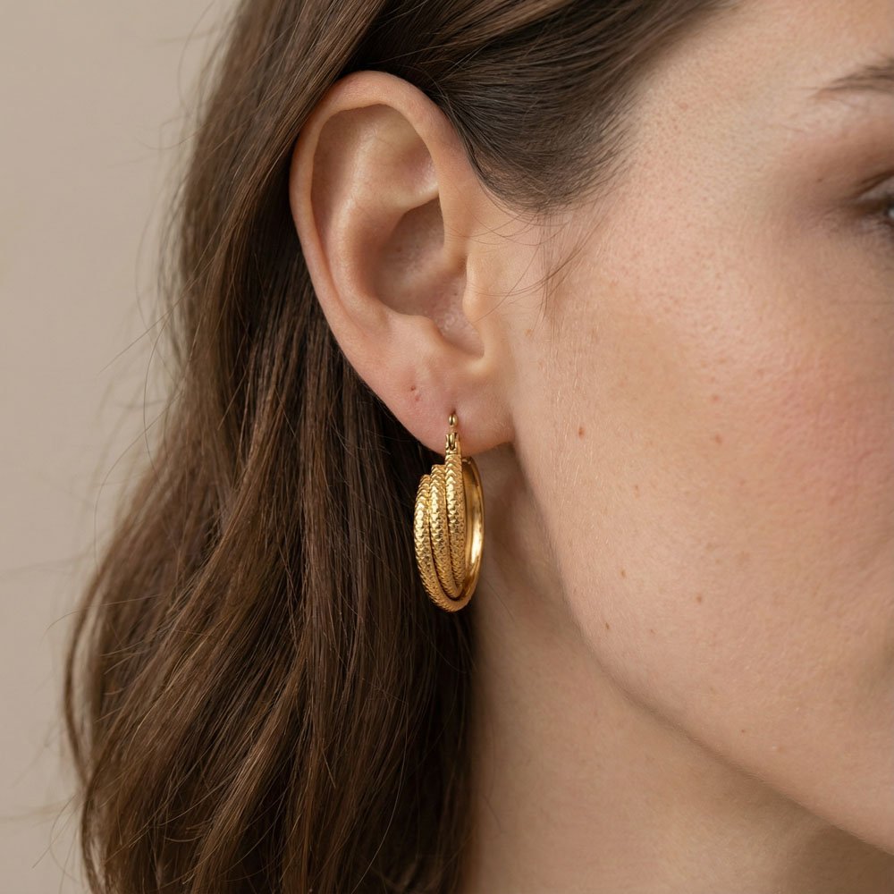 Σκουλαρίκια Χρυσά Selina – κρίκοι με τριπλό σχέδιο από ανοξείδωτο ατσάλι επιχρυσωμένο 14K, για λαμπερές και κομψές εμφανίσεις.